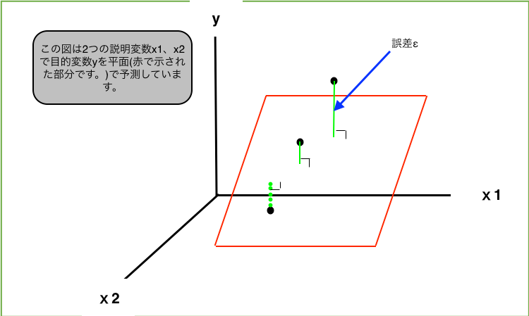 上の図からわかるように真の値と予測をしたyの値では誤差(上の図の緑線)が生じてしまいます。この誤差をεで表すと、先程のy=ax+bという式はy=ax+b+εと表せます。つまり、ε=y-ax-bとなり、この誤差は小さくしなければ良い予測ができたとは言えません。この誤差εを最小にするためのパラメータa,bを決めるのに有名な方法として最小2乗誤差法があります。最小2乗誤差法を説明をすると数学的になり数式が増えてしまうのでここではやめておきます。詳しく知りたい方は こちらのスライド21枚目を参考にしてみて下さい。ここではすでにわかっているn個の(x,y)の組(訓練データといいます。)を用いて最小2乗誤差法により最適なパラメータβ1,β0を求めています。