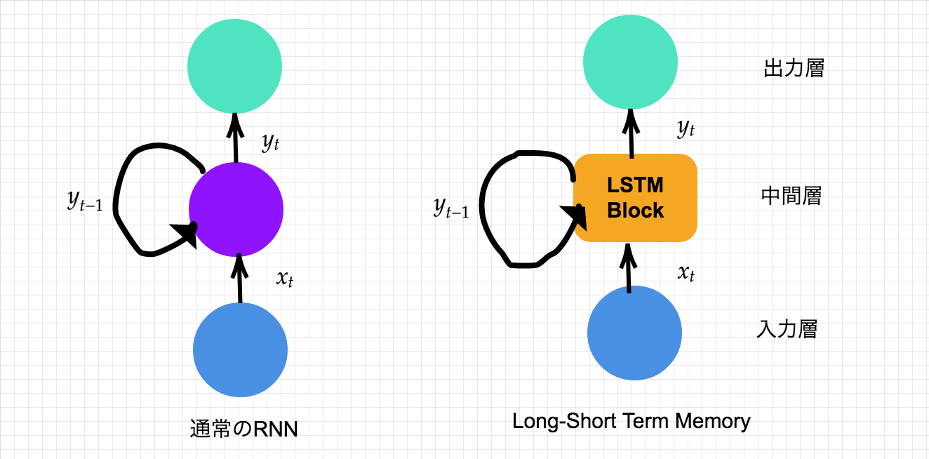 従来のRNNは、一度データを通して得た情報を、次のインプットと一緒に後続に渡す仕組みでした。
