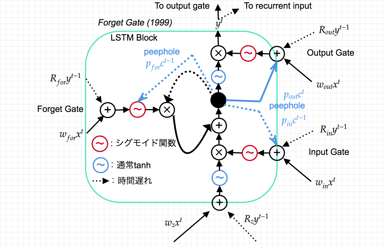 これらの図は、1999年に開発されたバージョンで、chainerのLSTMに実装されているものです。