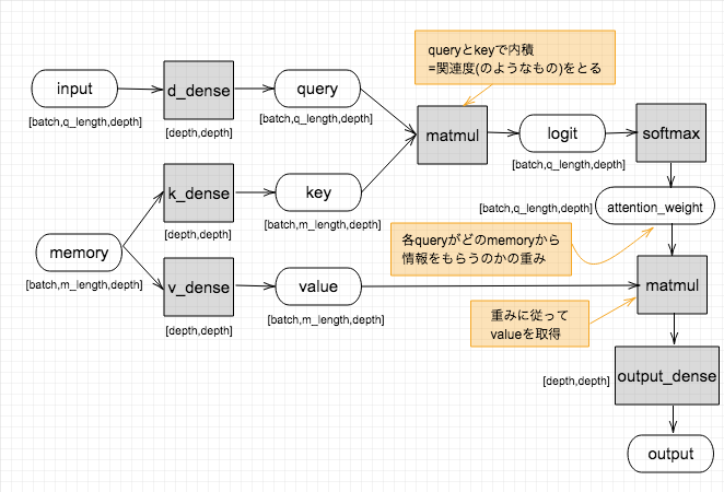 入力はinputとmemoryの二つに分けられています。それぞれtensorで、shapeは[batch_size, length, depth]となっています。例として、