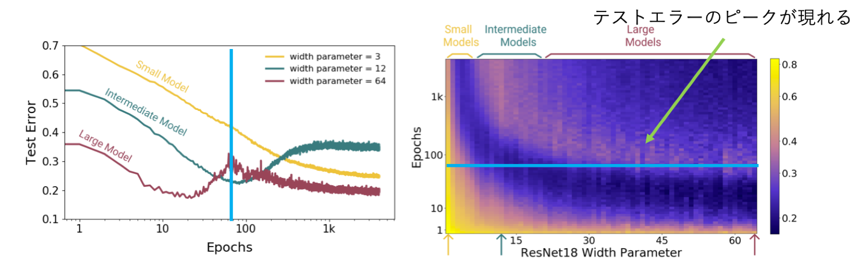 次に学習量に応じたテストエラーを見ていきます。左のグラフが馴染みのある学習曲線、右はテストエラーを深さとしたデプスマッピングです。学習量が多くなるにつれてEMCが大きくなることから、モデルサイズが大きくなるにつれてDouble Descentのような振る舞いが顕著に現れていることがわかります。また他のサイズでは範囲内の学習量ではUner-parameterized regimeの領域に属していることからモデルが小さい場合は引き続き学習を続け、その間のサイズであれば早期終了するなどして学習を止めたほうが良い事が読み取れます。