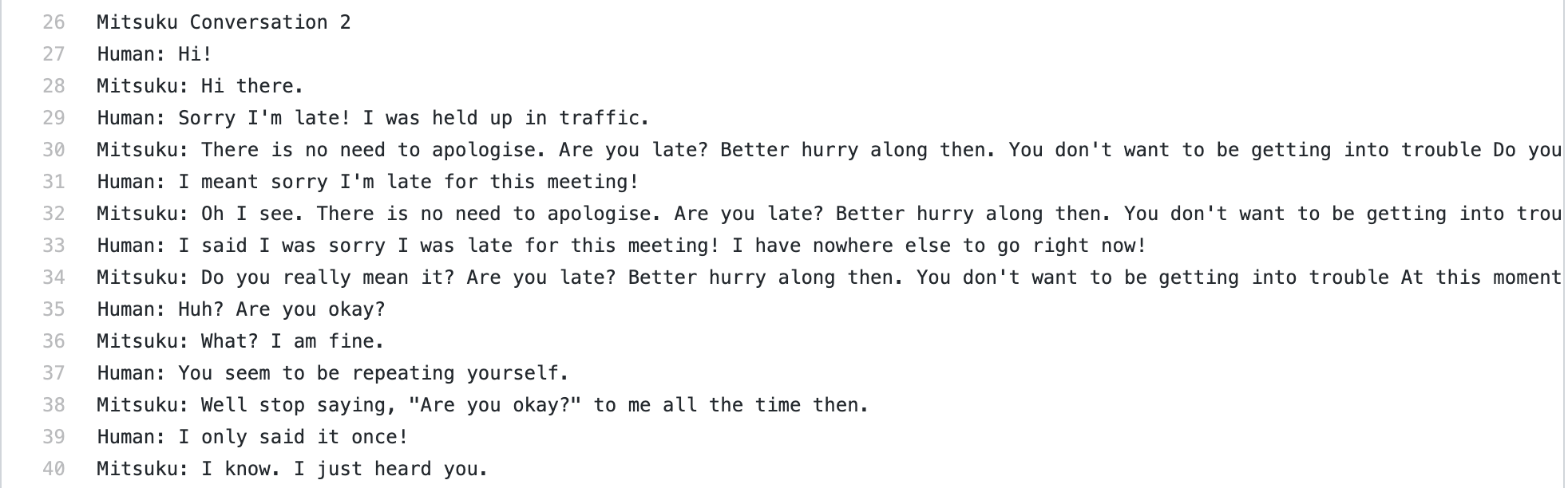 29行目で人間側が「遅刻した」と言っているのに、Mitsukuはその後3回も「あなたは遅刻したの?」と聞き返しています。ちゃんとした会話が成り立っていません。